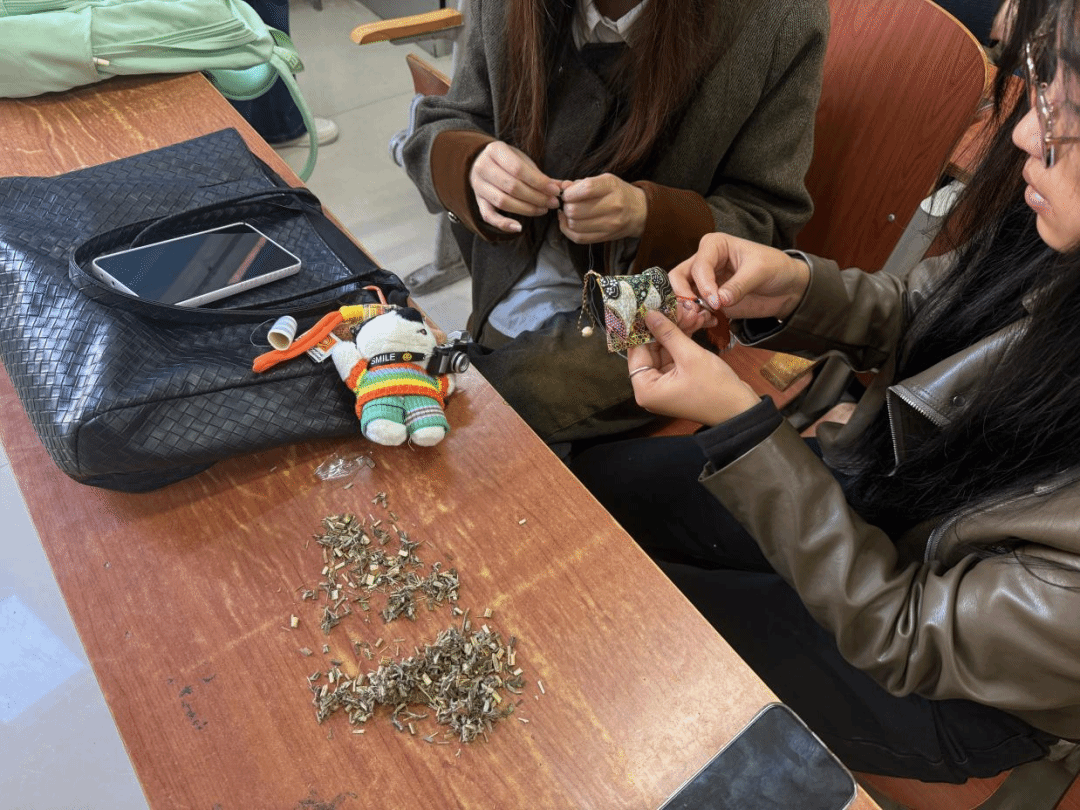 手工制作环节是活动的核心。桌面上,素色棉麻布料、晒干的茱萸碎末、五彩棉线、流苏挂饰整齐摆放。协会提前准备了简易针法教程,经验丰富的成员还一对一指导:“先把布料对折,沿着边缘缝出半圆,留个小口装香料”“绣图案时线要拉紧,这样花纹才立体”。起初,不少同学因不熟悉针线而手忙脚乱,线缝歪了、布料扎到手都是常事,但没人轻言放弃——有人对着教程反复练习平针缝,有人和同伴互相帮忙穿针引线,还有人突发奇想,在香囊上绣上校徽、“平安”字样,让传统物件多了几分校园特色。经过近一小时的制作,一个个造型精巧、药香四溢的香囊顺利完成。