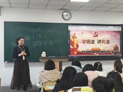 举行庄严宣誓,强化法治信仰。在冯润青老师的课堂上,一场庄严肃穆的宪法宣誓仪式令人印象深刻。全体学生整齐肃立、庄严宣誓,那字字铿锵有力的誓言,充分彰显了青年一代对宪法的绝对忠诚与坚定信仰。这一庄重的仪式将宪法权威深深镌刻在学生心中,为后续教学活动奠定了坚实的基础。
